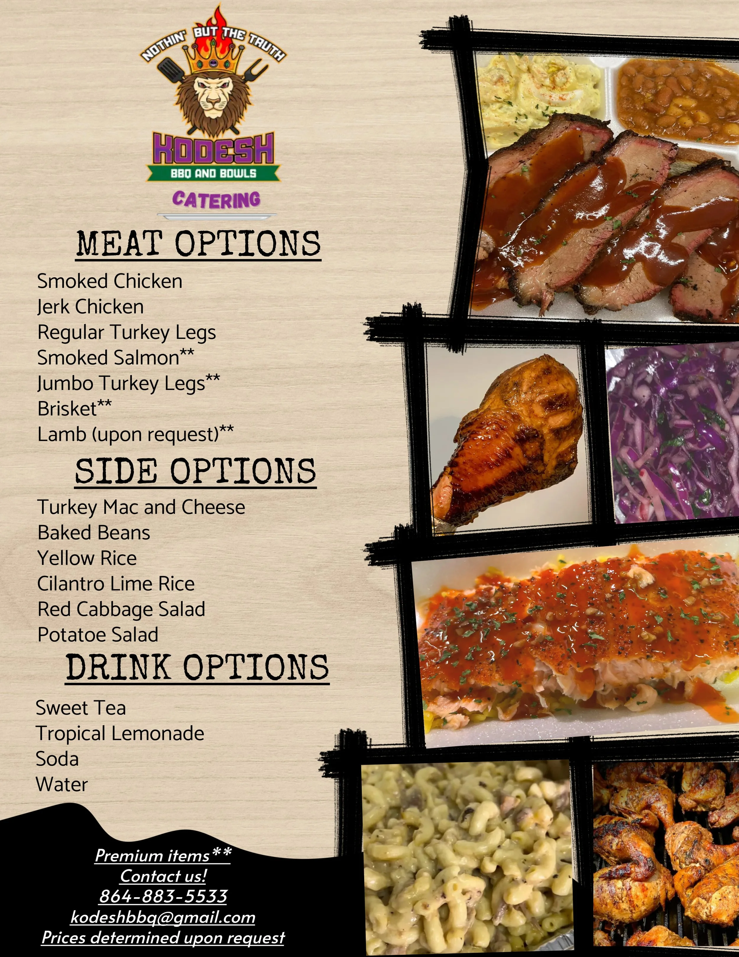 Having an event and in need of food? Allow us to take the stress off of your hands. Kodesh BBQ and Bowls offers a variety of meat and side options to enhance your event. Haven’t you heard? Our culinary skills don’t stop at the grill. If you can vision it we can make it happen.* Contact us for more information and price quotes. We look forward to serving you all!